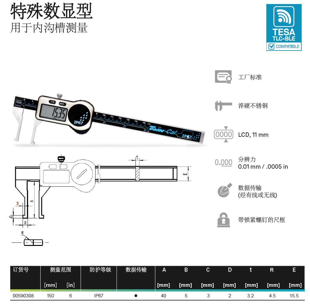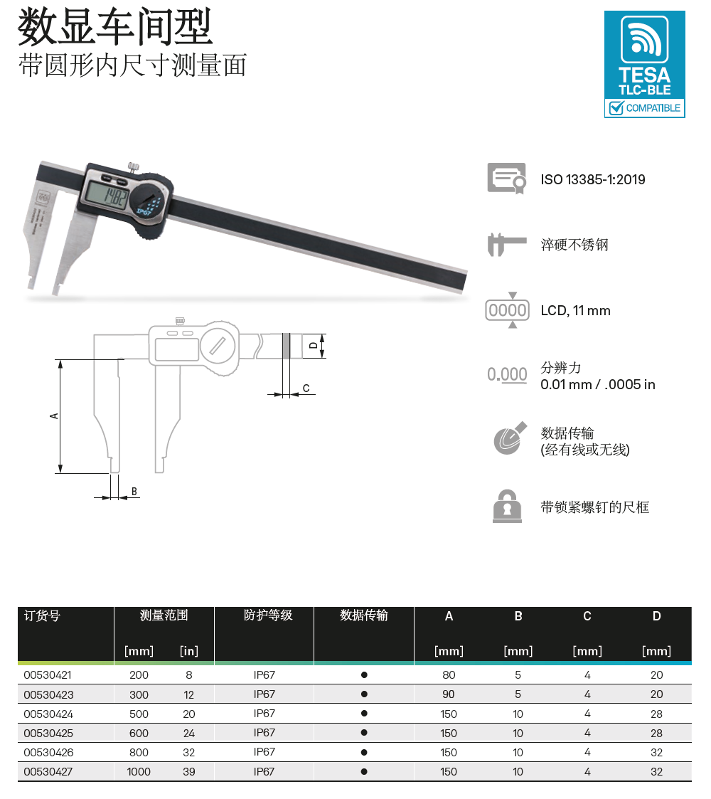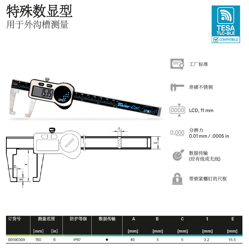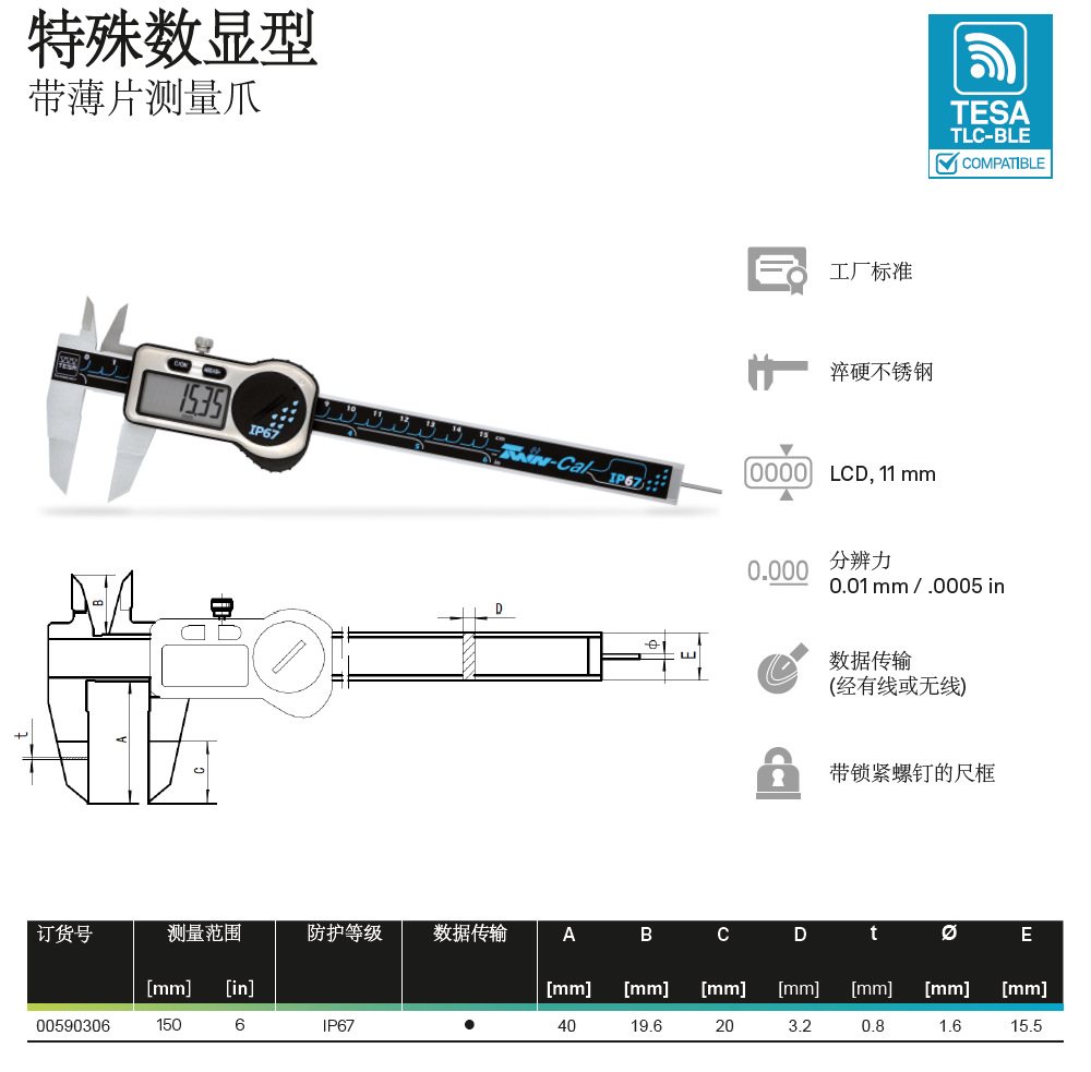 瑞士TESA无线蓝牙数显卡尺0-150-200-300mm通用型无线数显卡尺TLC-BLE无线尖爪卡尺蓝牙壁厚卡尺无线内外沟槽数显卡尺