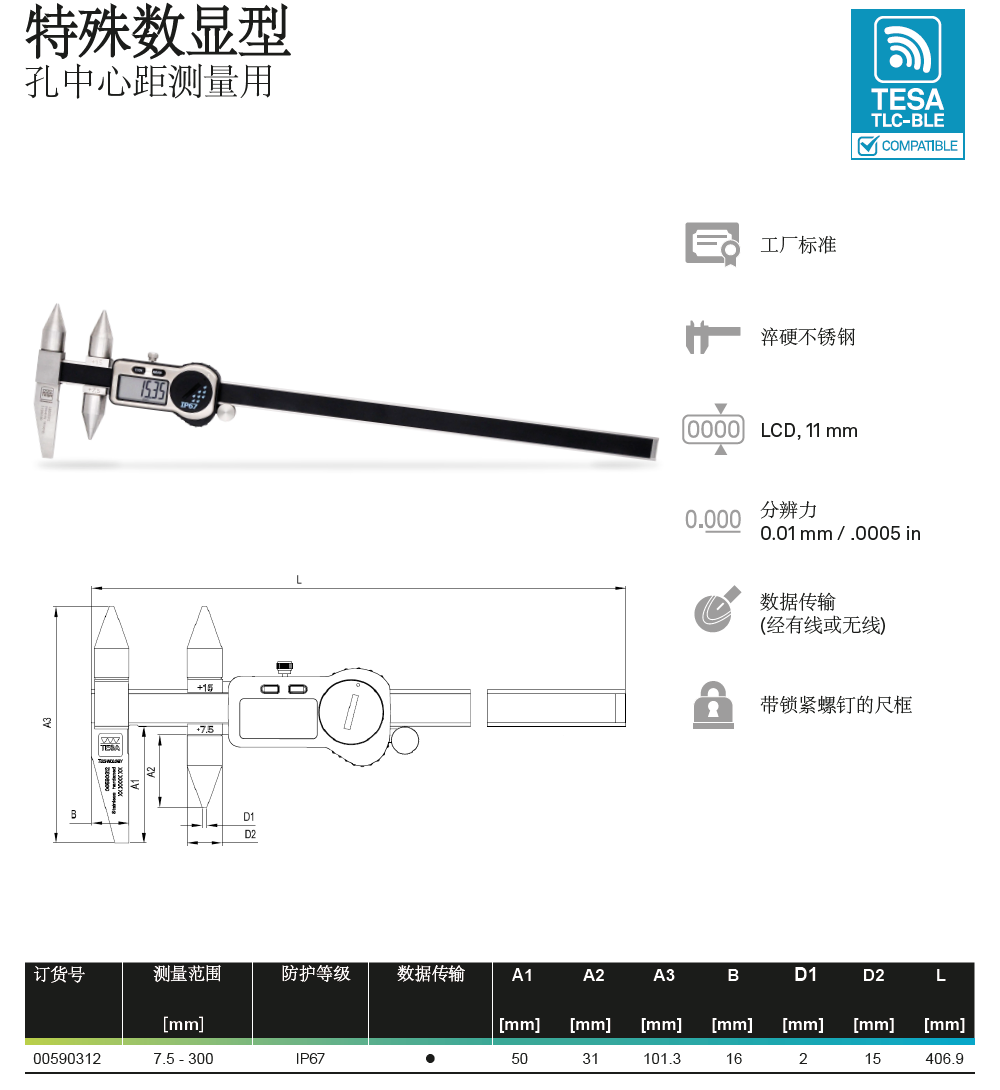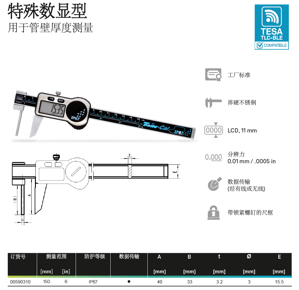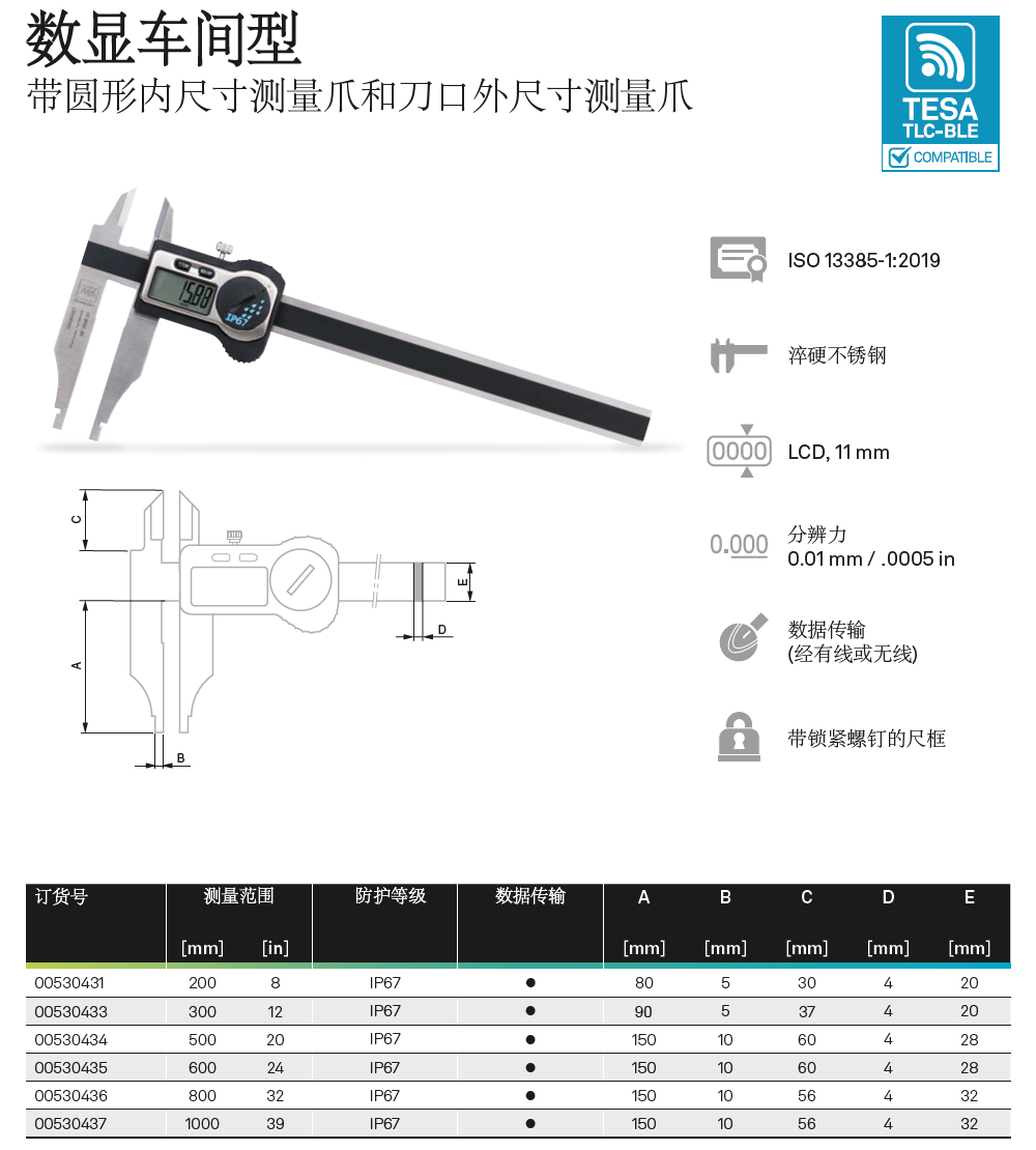 瑞士TESA无线蓝牙数显卡尺0-150-200-300mm通用型无线数显卡尺TLC-BLE无线尖爪卡尺蓝牙壁厚卡尺无线内外沟槽数显卡尺