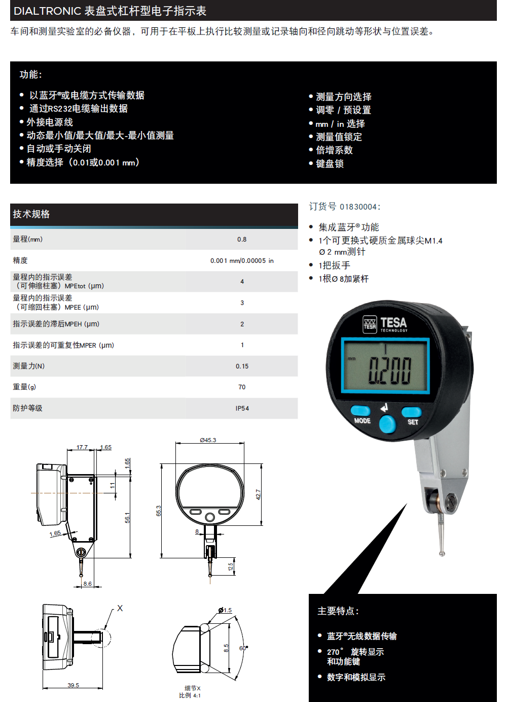 瑞士TESA无线蓝牙杠杆千分表DIALTRONIC电子杠杆千分表01830004无线蓝牙数据传输功能