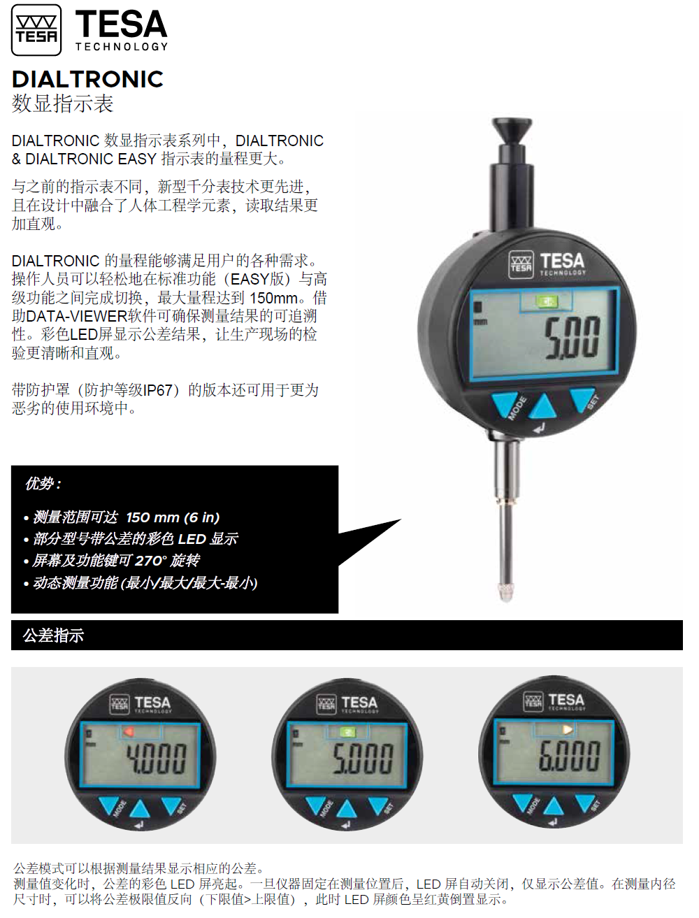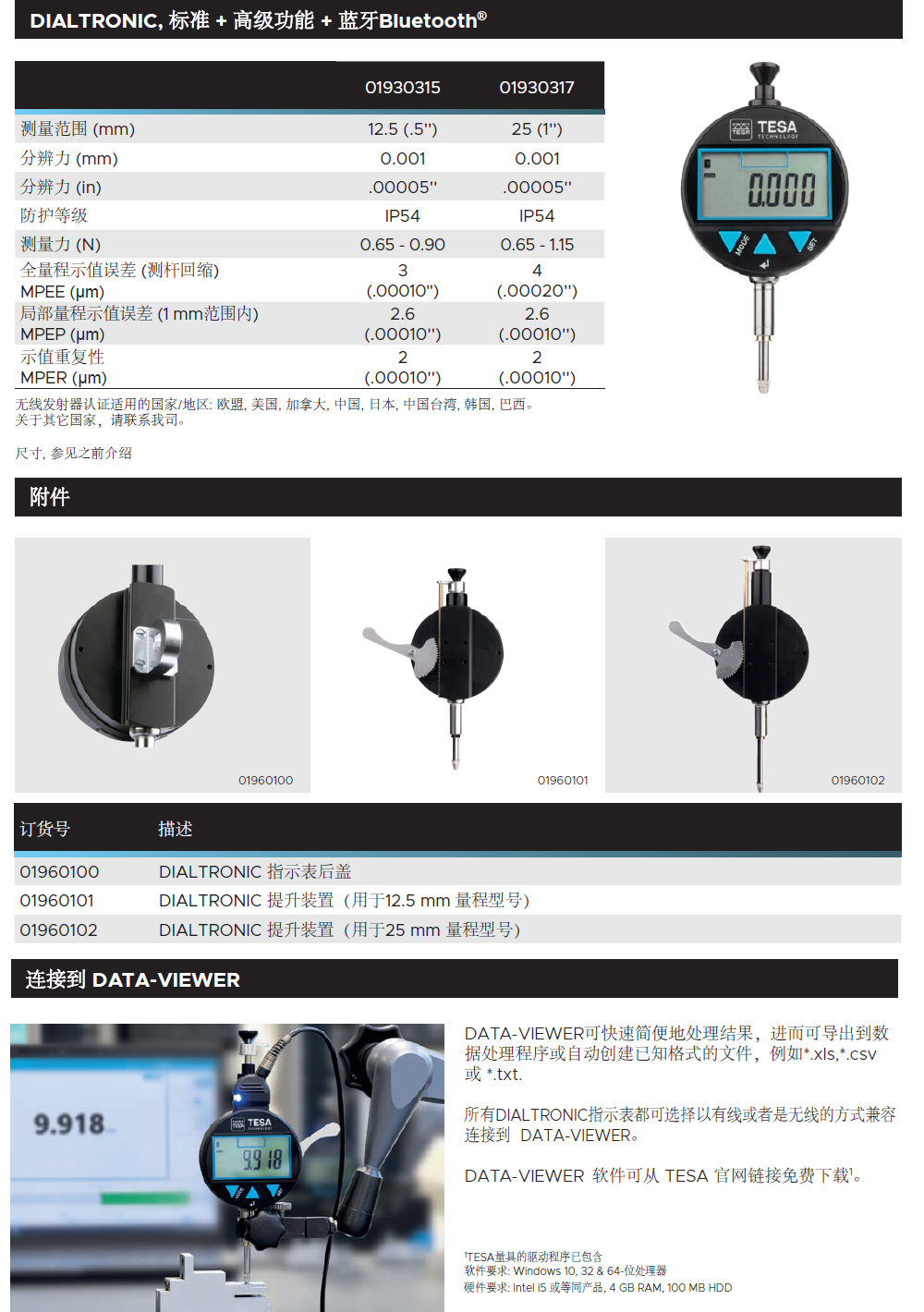 瑞士TESA无线蓝牙数显千分表DIALTRONIC, 标准 + 高级功能 + 蓝牙Bluetooth®输出。