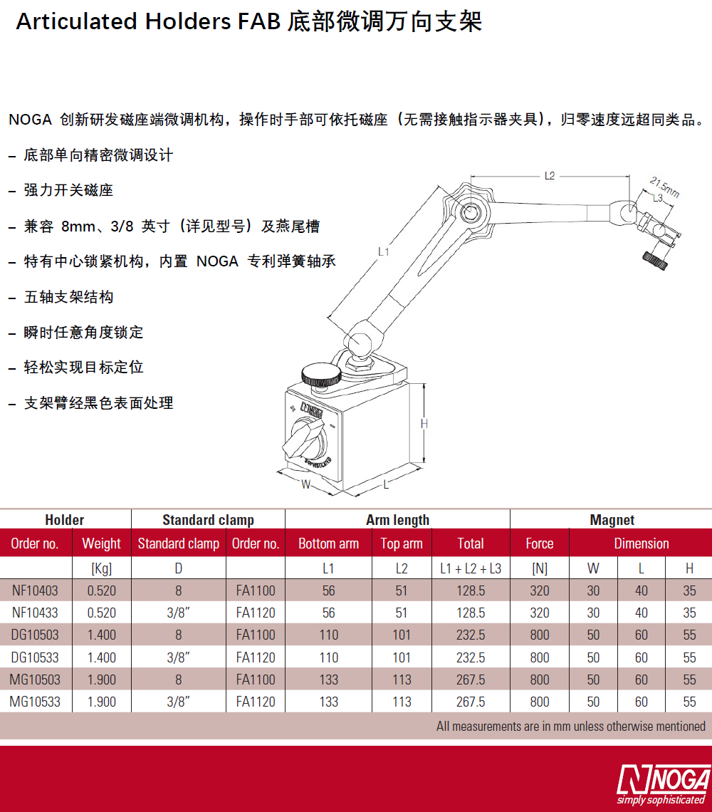 以色列NOGA诺佳精密测量固定支架:FAT顶部微调磁力表座,FAB底部微调磁性表座,FAT&FAB上下双微调万向磁性座,PH-FAT&FAB立柱式精密表座等