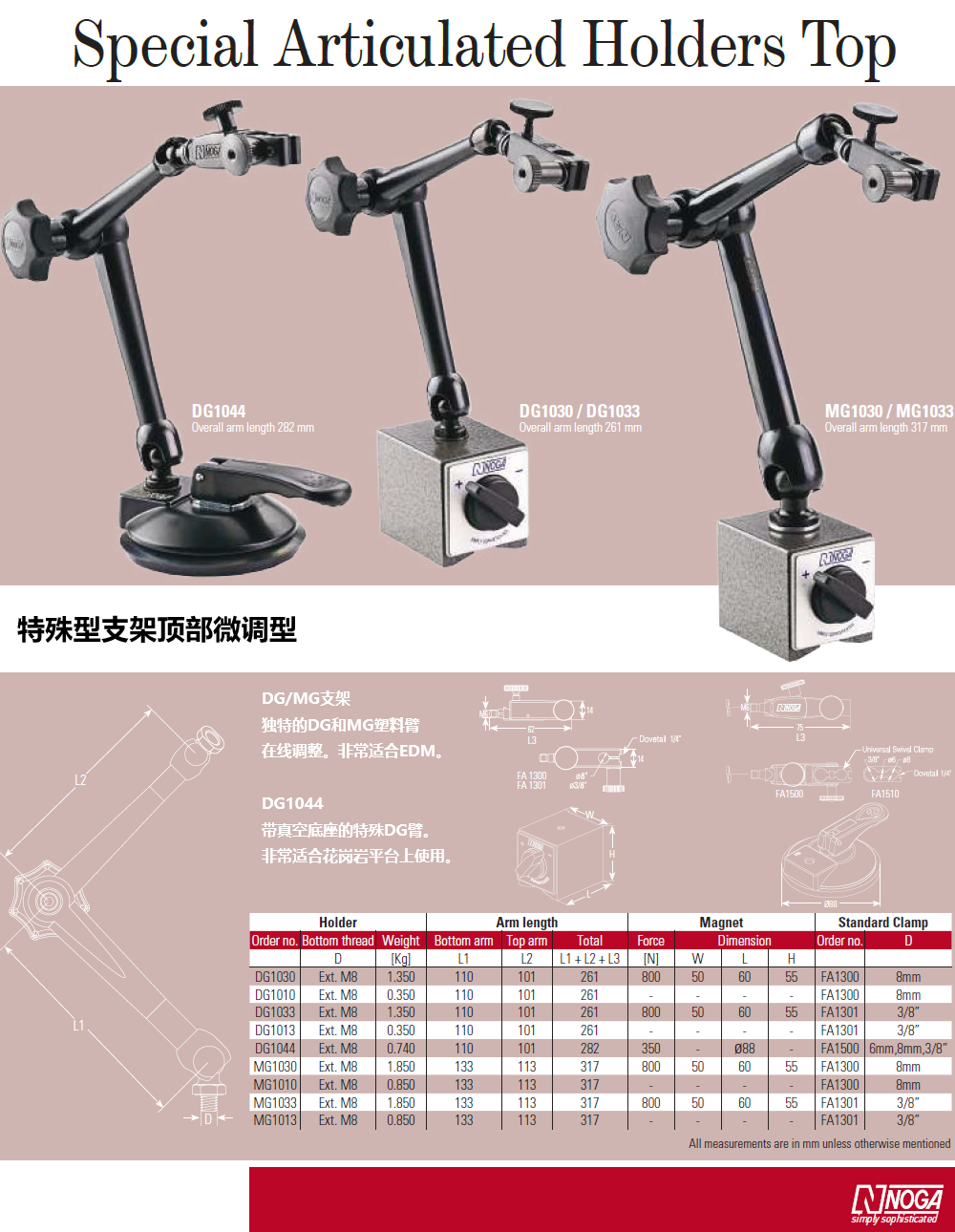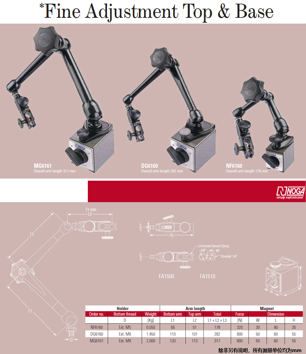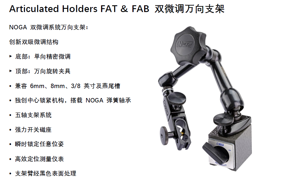 以色列NOGA诺佳精密测量固定支架:FAT顶部微调磁力表座,FAB底部微调磁性表座,FAT&FAB上下双微调万向磁性座,PH-FAT&FAB立柱式精密表座等