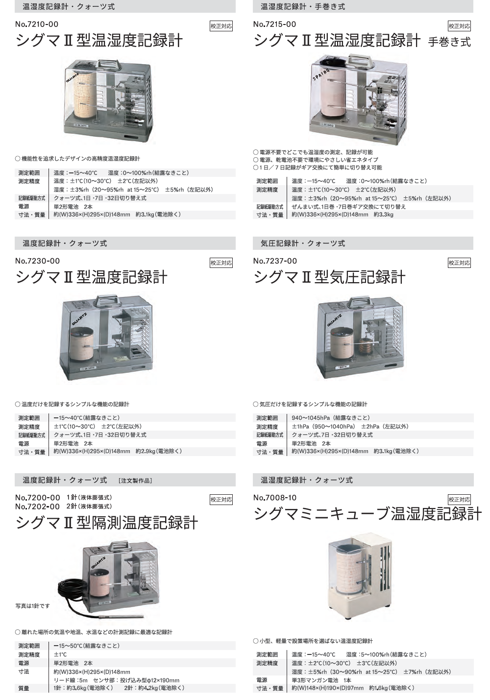 ■ Sigma II 温湿度记录仪在半导体和 LSI 生产工厂、环境实验室和化学品储存仓库等对温度和湿度控制特别重要的场所发挥其最大潜力。 主体采用PMMA树脂一体成型的外壳覆盖,可以从外部检查记录纸。 只需旋转提手即可打开和关闭箱子,易于安装和使用。 该装置还标配一张带有孔的 7 天记录纸,方便归档。 该时钟采用石英机芯,可在 1 天、7 天和 32 天之间切换,适合广泛用途。 |
